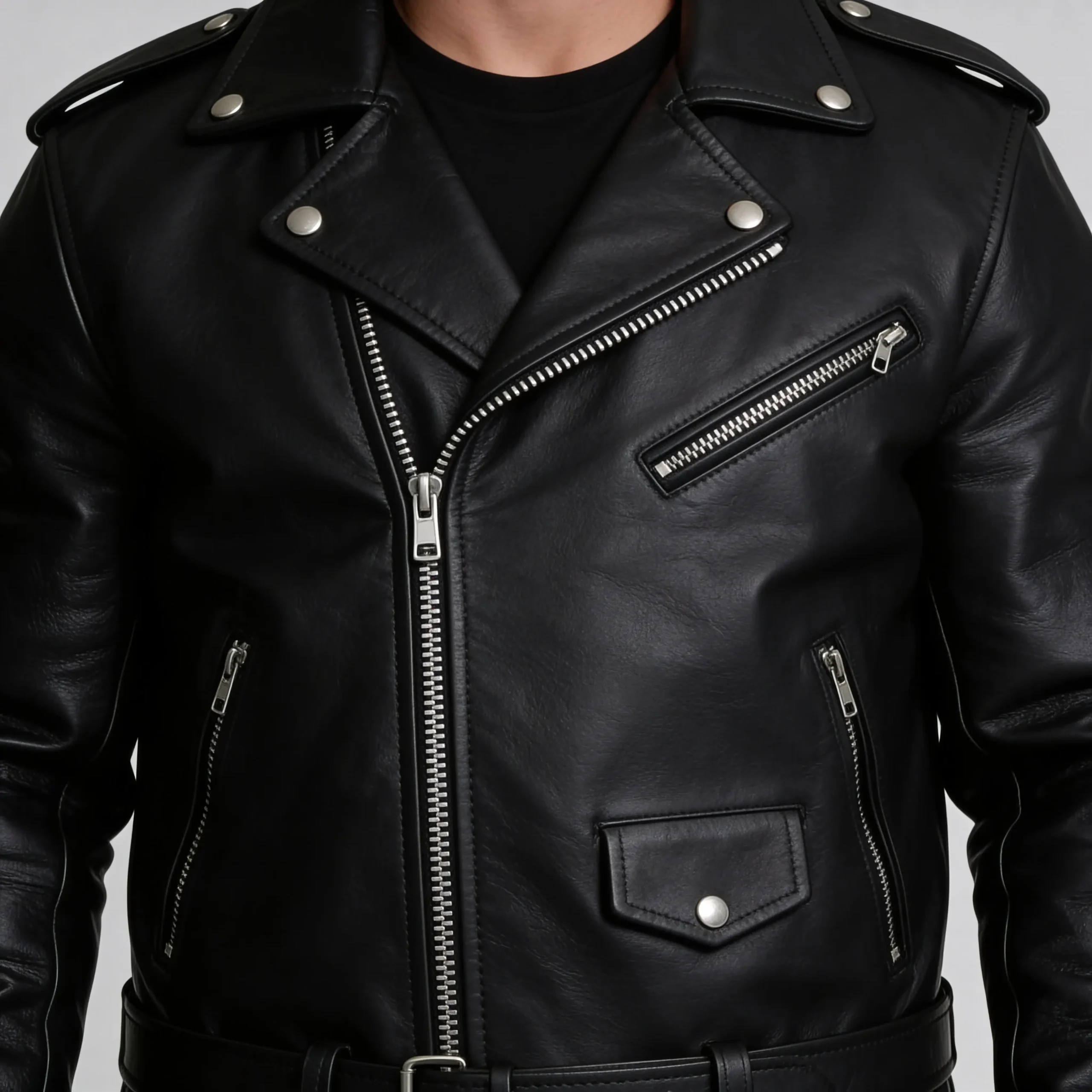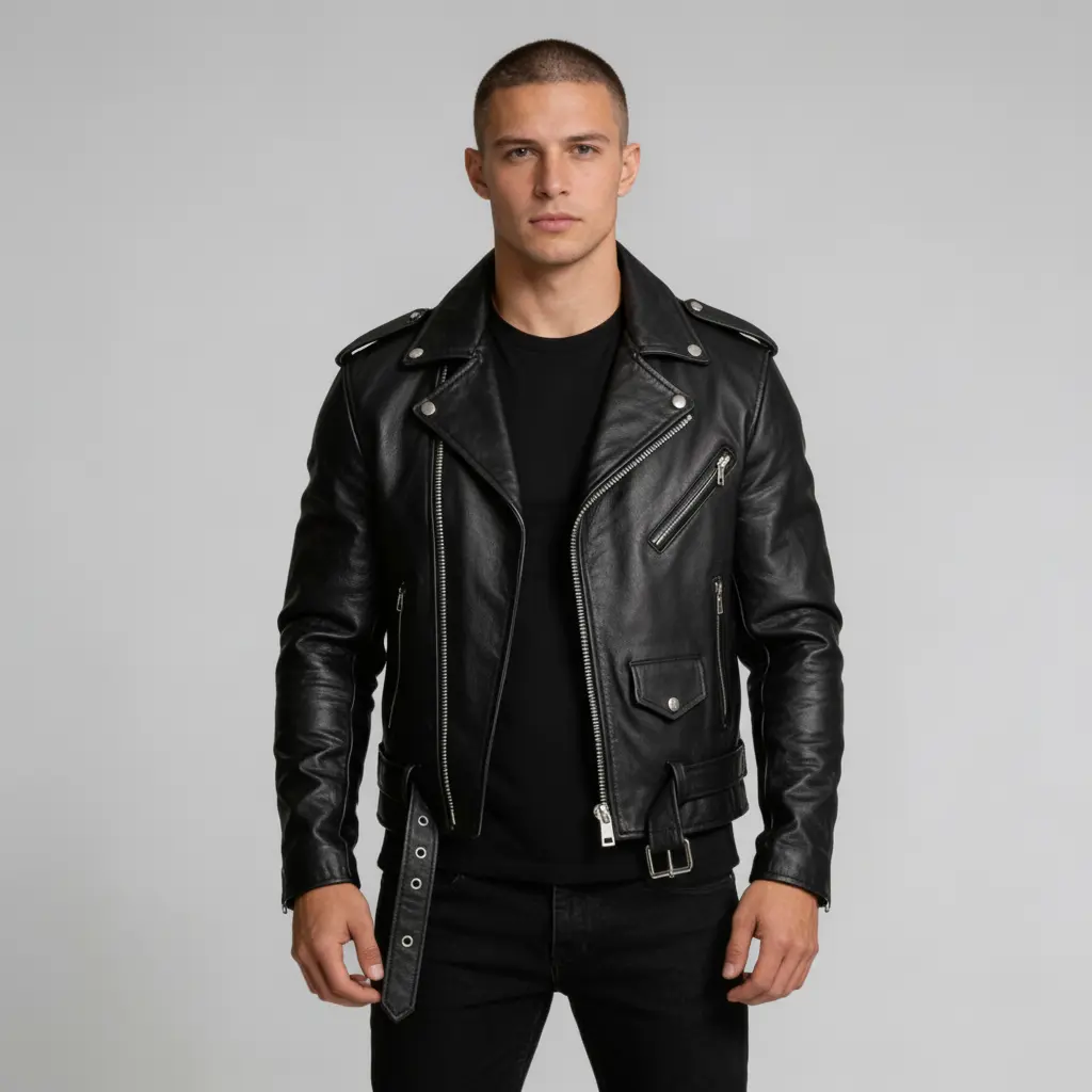 Men’s Black Belted Leather Motorcycle Jacket