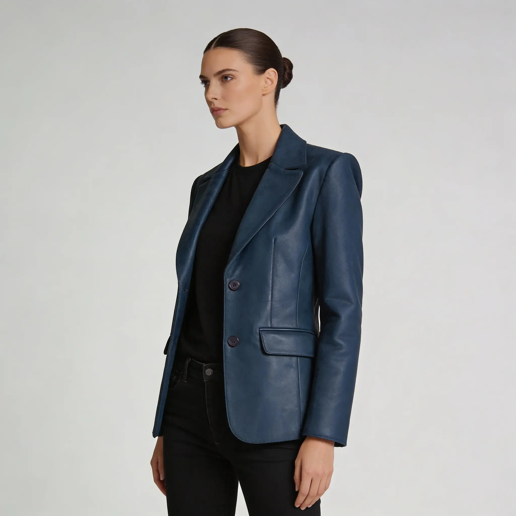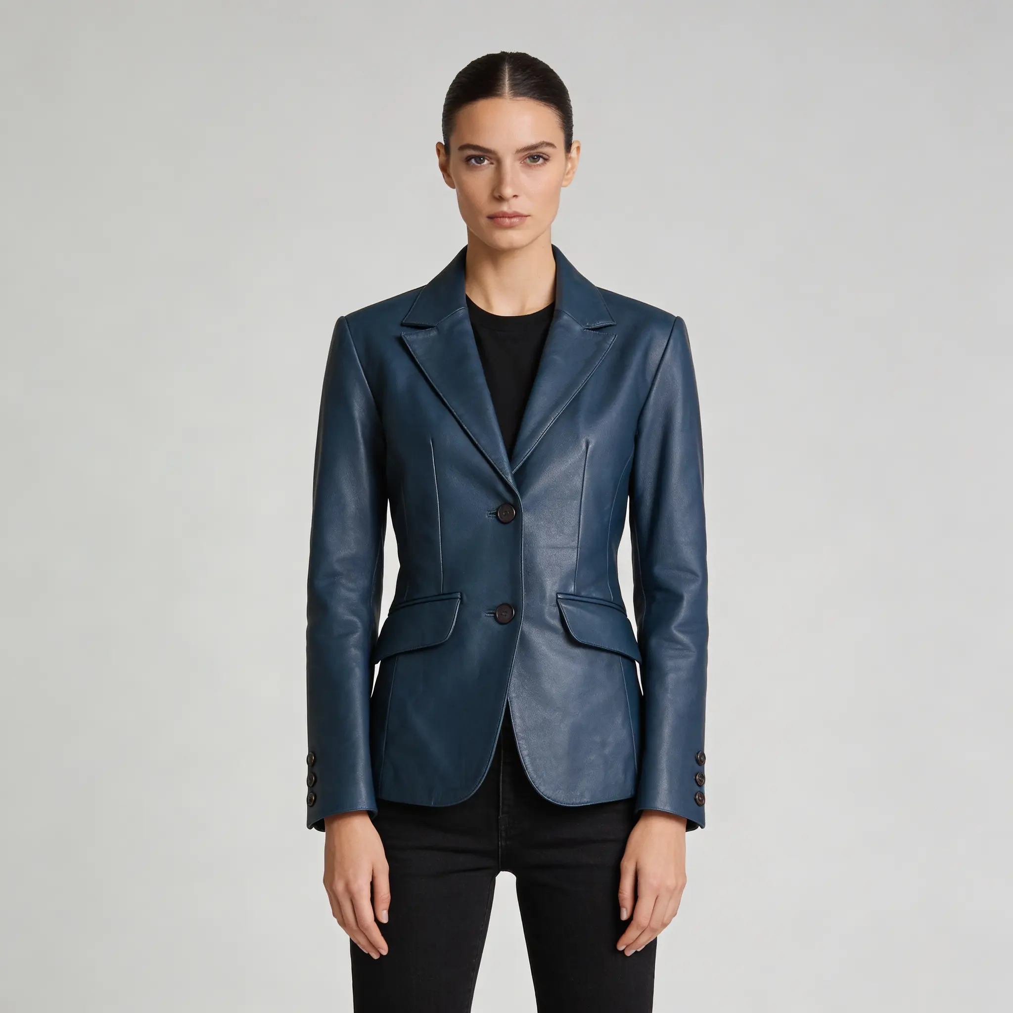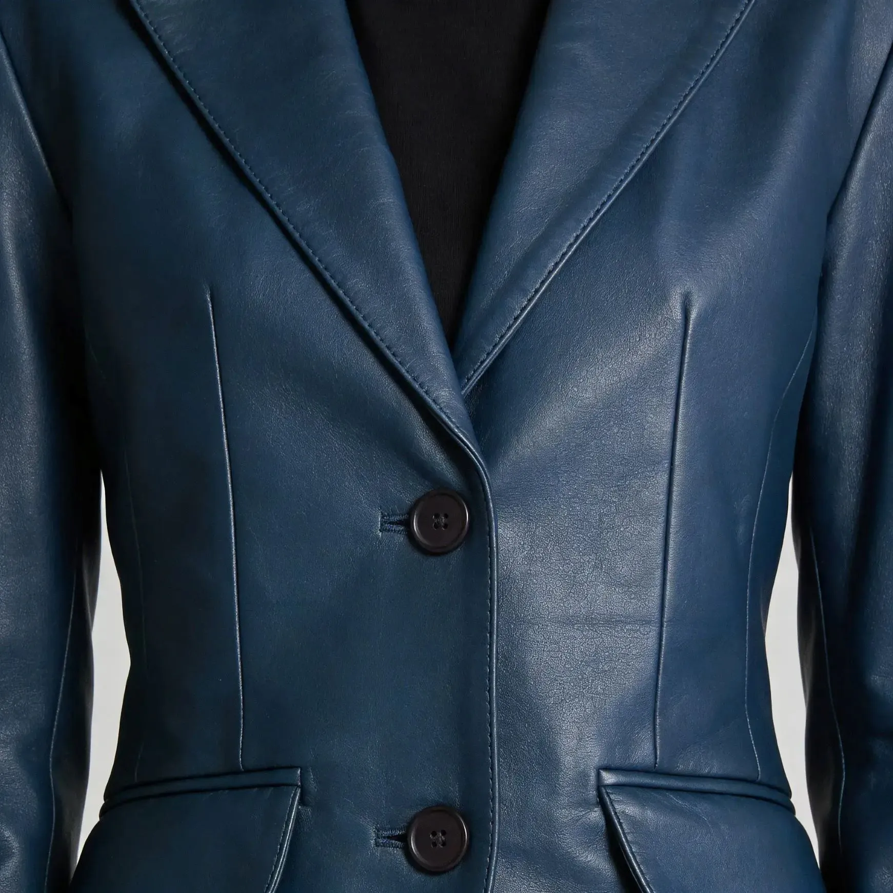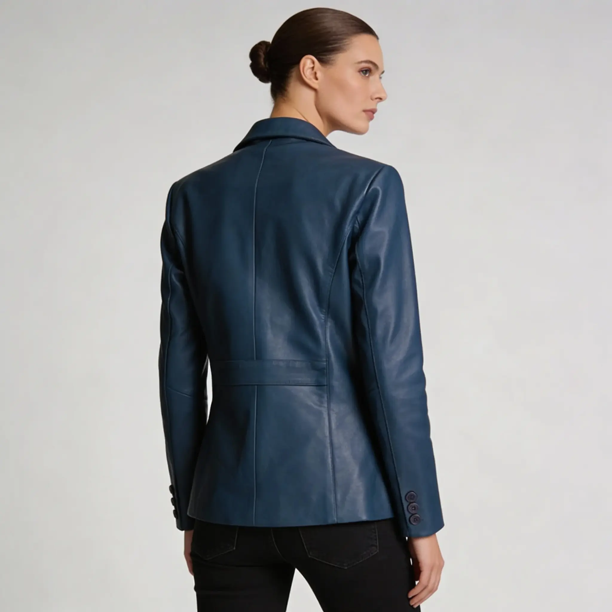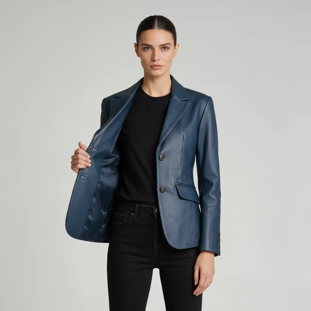 Elevate your style with the Women’s Blue Sheepskin Leather Blazer Jacket. A chic and timeless piece that adds sophistication to any outfit.